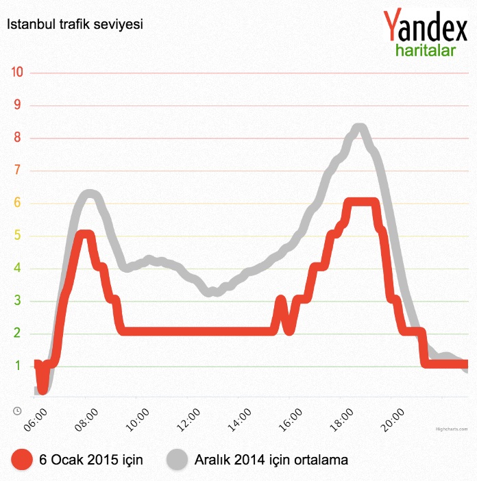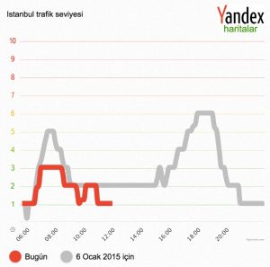 Yandex Trafik Bilgi Ajansı’ndan alınan bilgiye göre 7 Ocak sabahı, son 3 ay içinde İstanbul’da trafiğin en rahat olduğu sabah oldu. İstanbul Valiliği’nin okulları tatil etmesi, medyanın uyarıları ile çalışanların kişisel araçları yerine toplu taşımayı tercih etmesi trafiğin büyük ölçüde rahatlamasını sağladı. Sabah saatlerinde Yandex trafik endeksine göre 10 üzerinden 3 seviyesinde olan trafik, öğlen ise en fazla 2 seviyesine ulaştı. İstanbul’da son 3 ayın genelinde sabah erken saatlerde trafik endeksinin ortalama 6, öğlen ise 3-4 seviyelerinde olduğu görülüyor.