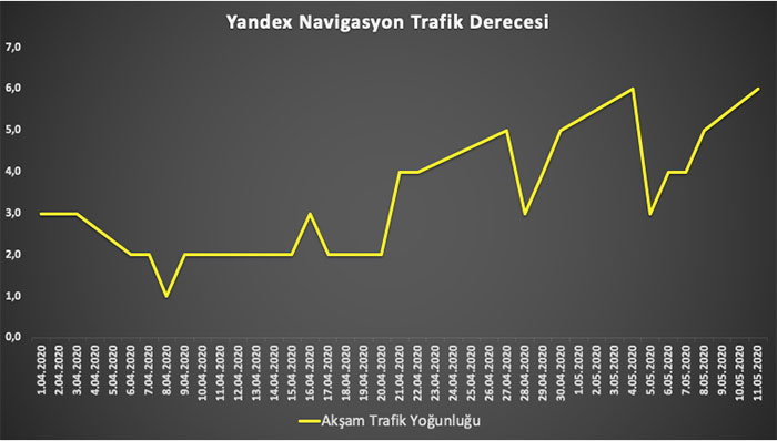 Sokağa çıkma yasağının uygulandığı hafta sonlarının hemen ardından, 4 Mayıs ve 11 Mayıs Pazartesi günlerinde İstanbul’un akşam trafiği yoğunluğu, 1’den 10’a kadar numaralandırılan derecelendirme sistemine göre 6 dereceyi buldu.