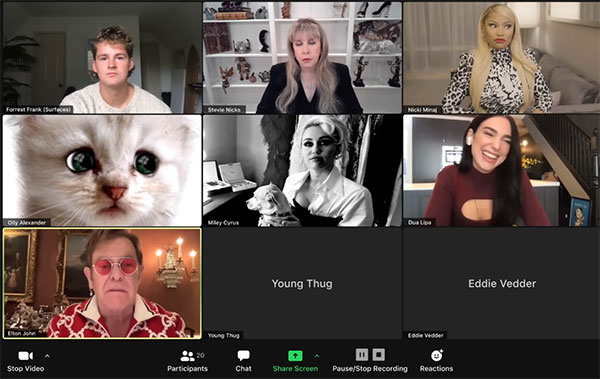 Elton John yeni albümü The Lockdown Sessions için birlikte çalıştığı Dua Lipa, Damon Albarn, Stevie Wonder, Miley Cyrus, Lil Nas X, Stevie Nicks, Young Thug ve daha birçok ünlü isim ile bir Zoom buluşmasında bir araya geldi.