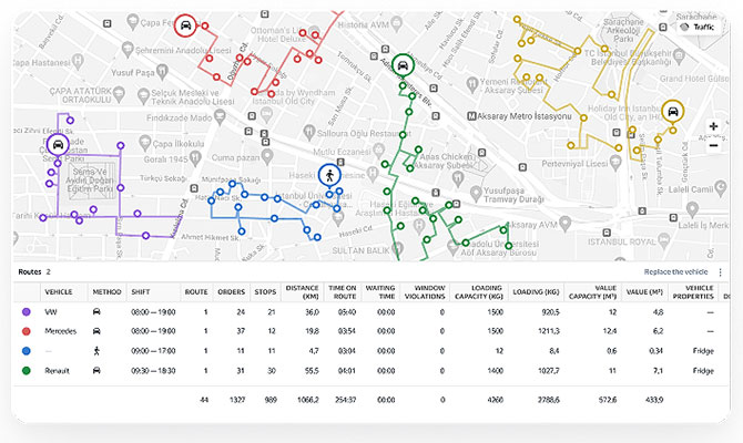 İyi haritalar, hassas trafik tahmini ve optimizasyon algoritmasına sağlanan operasyonel kısıtlarla, RouteQ her teslimat için en uygun rotaları oluşturuyor.